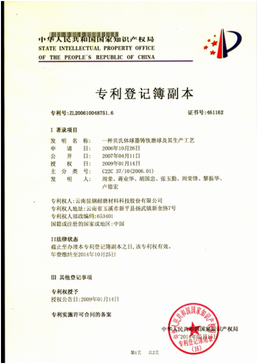 As the first wear resistant material producer listed on “new three board” in China, stock code 831212, Yunnan Kungang Wear Resistant Material Science Co.,Ltd. implements the market transaction. The company has obtained the ISO9001 quality system certificate, ISO14001 environmental management system certificate, national high-tech enterprise certificate, Yunnan high-tech enterprise certificate,Yunnan brand product certificate, China foundry association membership certificate. The company has found Yuxi Wear-resisting material of science and technology research center and won honners,such as the high quality casting gold medal the first prize of Yunnan science and technology invention and so on.